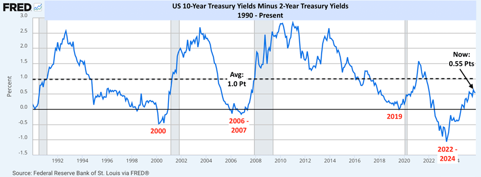 As a result, we should see further yield curve steepening, with the spread between the 2- and 10-year Treasury yields approaching their long-term average of 1%. I see the 10-year moving back to 4.5% in that process, as the 2-year bottoms in the 3-3.5% range near a neutral Fed funds rate. Bears suggest this yield curve steepening is bearish, as it was in 2000, 2007, and 2019, but those resulted from short-term rates rising. This steepening should come from the short-term rate falling, which is a critical distinction.